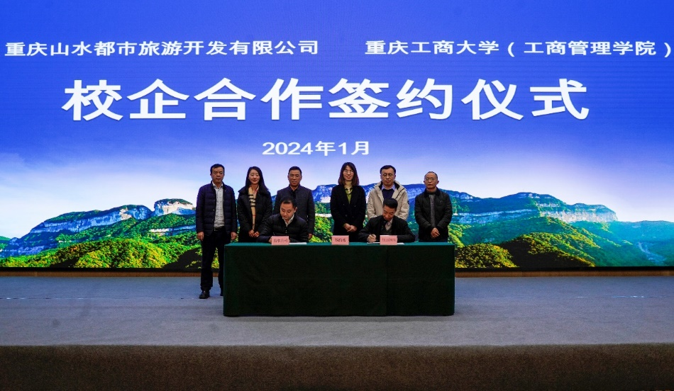 2024年1月11日下午,重庆工商大学44118太阳成tyc城集团与重庆山水都市旅游开发有限公司校企合作签约仪式在南川区天星酒店顺利举行。山水公司总经理王军波等企业团队与44118太阳成tyc城集团市场营销与商务策划系主任付青叶等教师团队共同出席了签约仪式。