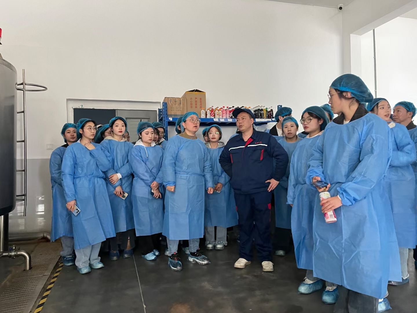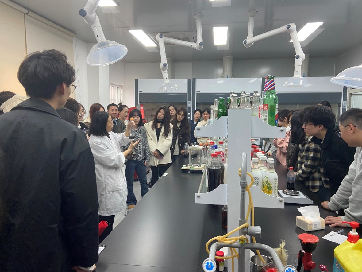 随后,师生一行进入研发实验室参观,了解了天府可乐(重庆)饮品有限公司产品配料和原料等总体情况,期间由产品研发部经理涂雪令展示可乐原浆调配过程,并在现场抽取了5名同学动手实践进行可乐调配。