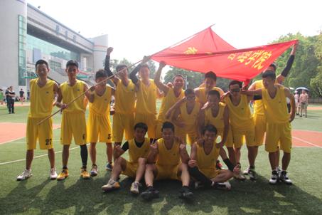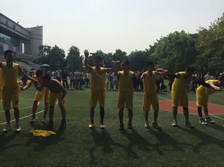 欢呼声,呐喊声连成一片,身着黄色战袍的管理学院篮球运动健儿们,手握手站成一排,向现场所有观众鞠躬致谢……