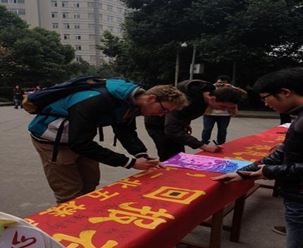 值得一提的是,许多在我校留学的外国同学也被这次签名活动新奇的形式和壮观的场面所吸引,纷纷前来签名参与!其中一位叫里昂那多的外籍同学让大家记忆犹新。这位我校国际商学院的留学生,来自法国,他用让全场惊叹的工工整整的汉字写下了自己的名字和感恩节祝福!