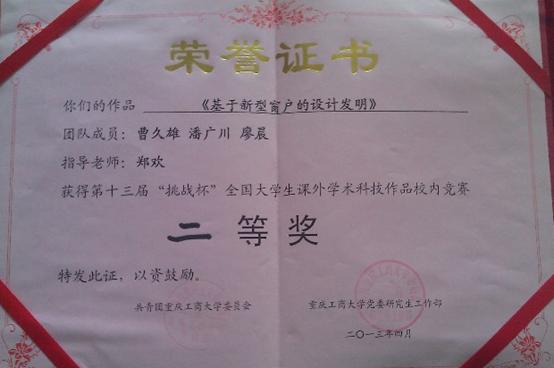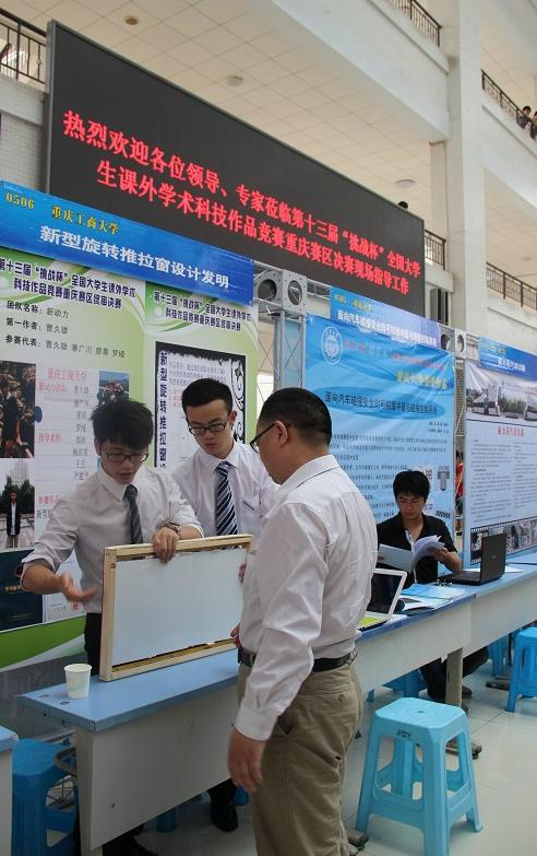 此前,经学院领导高度重视,校团委、研工部精心组织,曹久雄等同学的作品在我校赛区的总决赛中,从校内105件作品中脱颖而出,荣获二等奖,并与其他14件作品一起参加重庆赛区决赛。在重庆市决赛现场,经现场展示、秘密答辩等环节,我校喜获特等奖2项、一等奖3项、二等奖1项、三等奖1项,其中,曹久雄等同学的作品《新型旋转推拉窗设计发明》获得重庆赛区二等奖,展示了管理学院学子的风采。