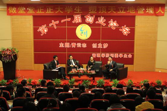 11月21日,第十一届创业论坛主论坛在我校博智楼7200学术报告厅隆重举行。此次论坛以“青云志·创业梦”为主题,由管理学院人力资源管理系主任鄢清华老师主持。校团委唐玺副书记、学生处潘焱副处长以及管理学院党总支书记段远鹏教授等学院领导出席了论坛,重庆山外山科技有限公司高光勇董事长、圣雅菲养生美容连锁集团徐楠董事长等嘉宾应邀出席本次论坛。