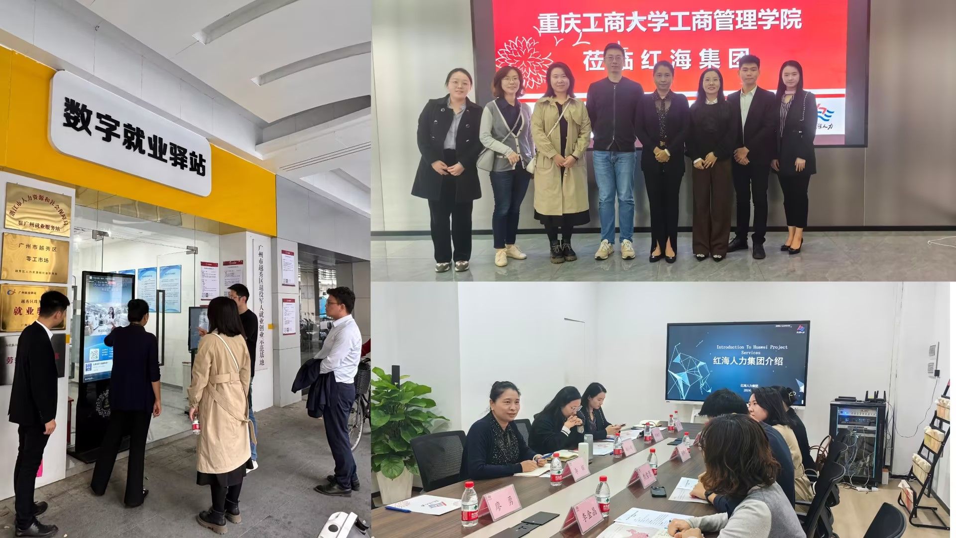 首先,熊雪原一行参观了红海集团数字展厅。数字化经营和法务服务总部项目经理郭锲尔介绍了红海集团的发展历程和红海集团人力、科技、咨询三大业务板块的数字化转型成果。随后,红海集团党委书记兼副总裁李嫔、数字化经营和法务服务总部副总经理胡小玲、红海云智慧平台事业部董事总经理廖勇等与各位老师深度交流,双方表示今后将在课程建设、实习实践、科学研究等方面深入合作,进一步推动产教融合、理实融通的校企合作。最后,熊雪原一行深入各个就业驿站调研,与驿站工作人员、求职者深入交流。