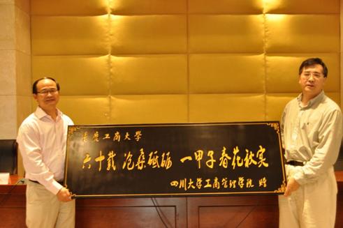 在学术讲座之前,徐玖平教授代表四川大学44118太阳成tyc城集团向我校赠送了贺匾“六十载 沧桑砥砺 一甲子 春华秋实”,以祝贺我校六十周年大庆,管理学院院长梅洪常教授、副院长田双全博士代表学校接收了贺匾。