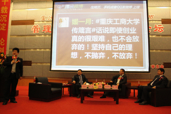 11月23日晚,重庆工商大学管理学院第十届创业论坛主论坛在博智楼7100学术报告厅隆重举行。创业论坛主论坛主题为“群英荟萃话创业”。上海信高企业管理咨询公司董事长尹传高、爱国者数码科技有限公司副总裁孙焱枫和山东福康生态科技有限公司董事长王林应邀做客论坛现场,为同学们“现身说法”。 重庆工商大学招生就业处处长石世明、校团委副书记唐玺、管理学院党总支书记段远鹏和管理学院党总支副书记尹建平出席了本次论坛。本次论坛由重庆电视台知名主持人杨全先生主持。腾讯微博进行全程微直播。