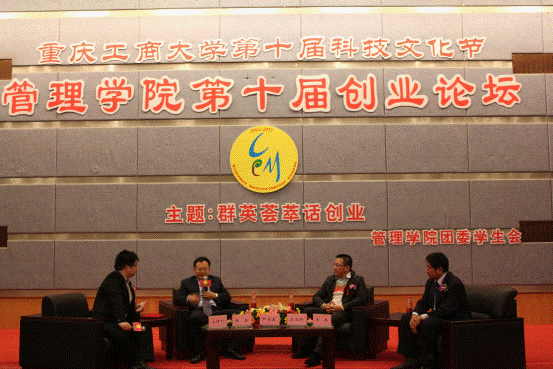 11月23日晚,我校第十届科技文化节暨管理学院第十届创业论坛在博智楼7100报告厅隆重举行,主题为“群英荟萃话创业”。上海信高企业管理咨询公司董事长尹传高先生、爱国者数码科技有限公司副总裁孙焱枫先生和山东福康生态科技有限公司董事长王林先生应邀做客论坛现场,为同学们“现身说法”。本次论坛由重庆电视台知名主持人杨全先生主持、“腾讯微博”进行全程微直播。
