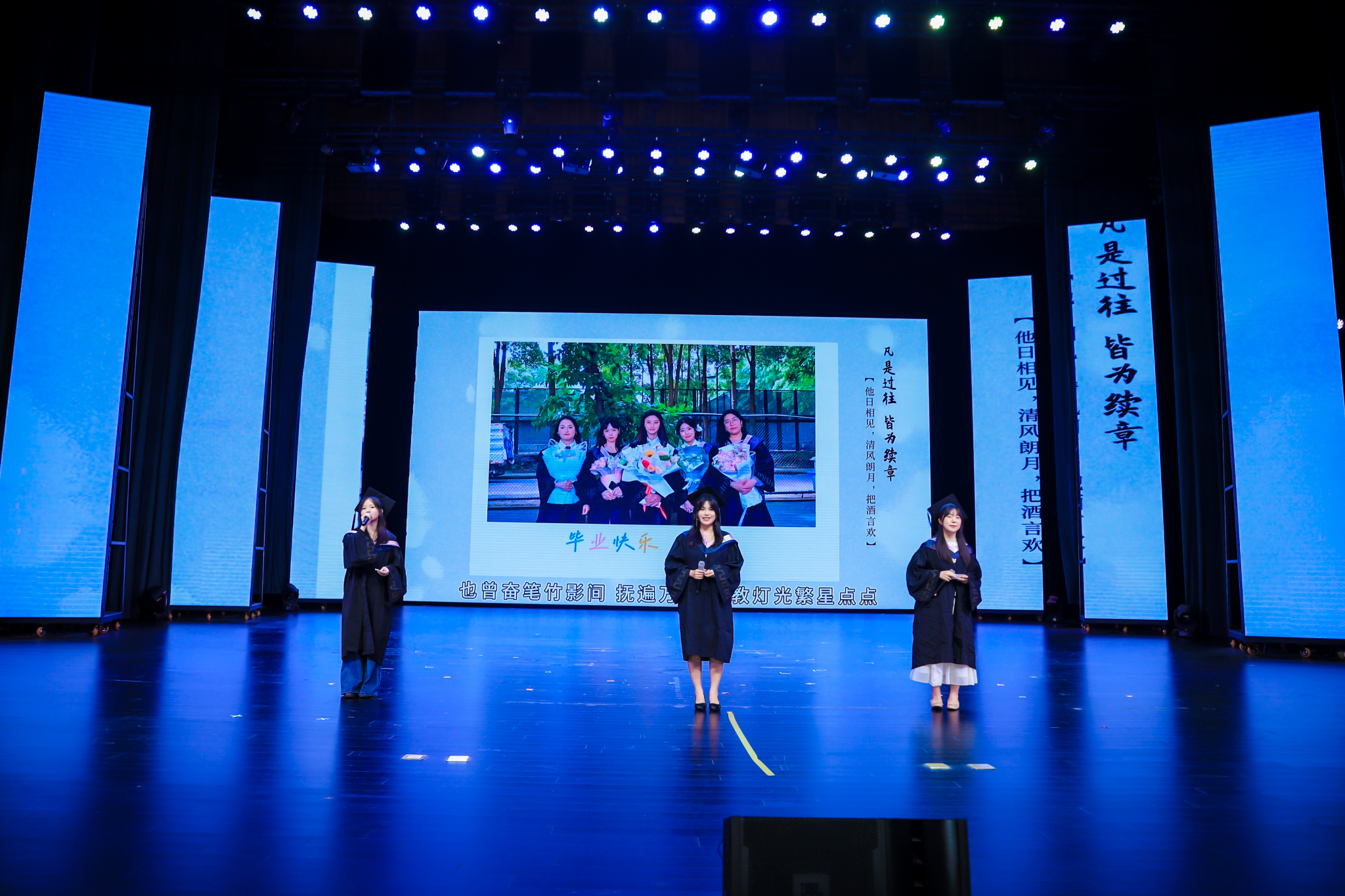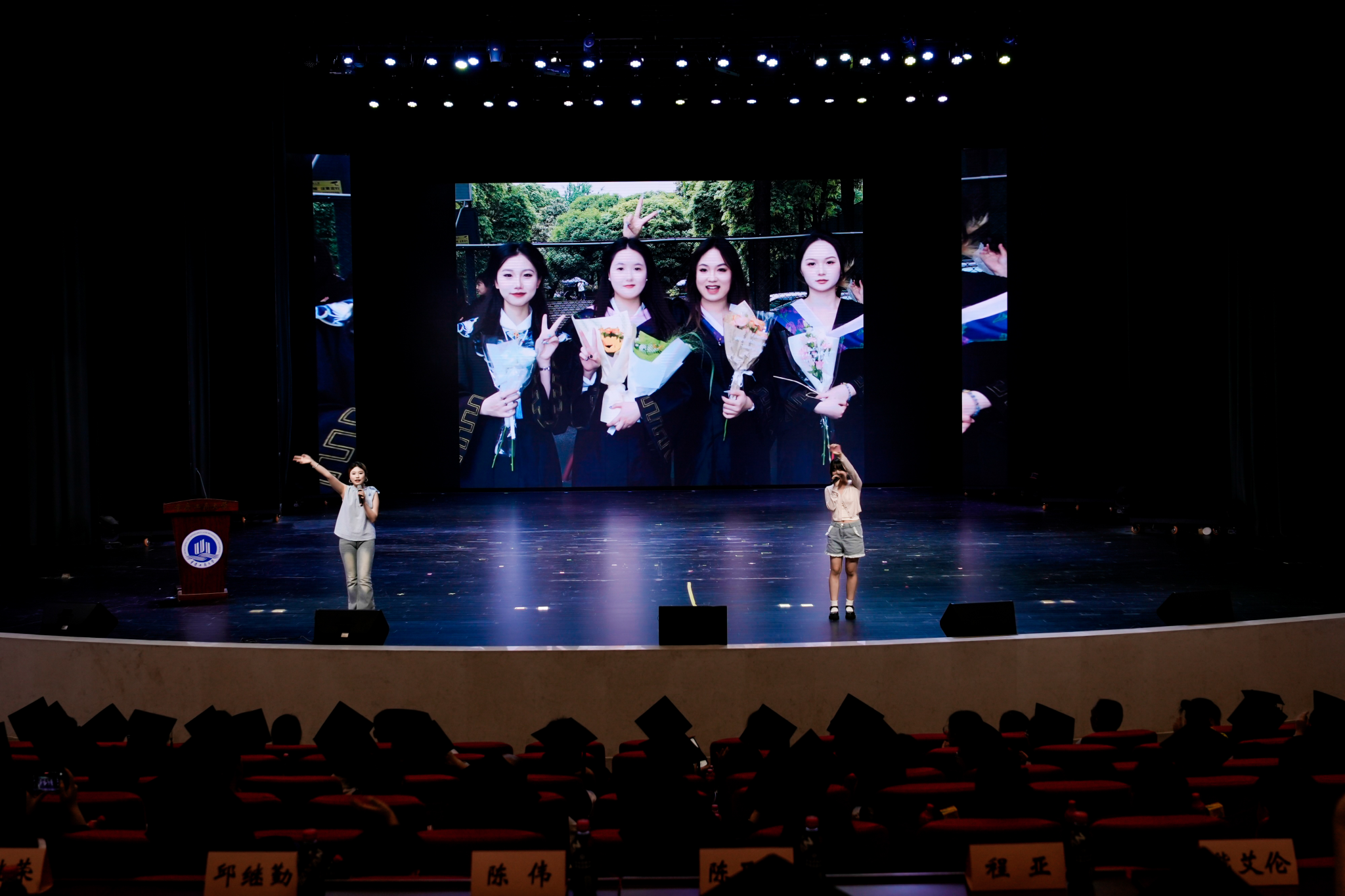 舞台之上,低年级学生余婷婷、孙士颖歌以一曲《绿光》传递美好祝愿;毕业生代表吕萱、黄静宜、袁梦姣改编演绎的《起风了》,更是点燃全场热情,台上台下的合唱声浪,将青春的炽热与对未来的憧憬推向高潮。