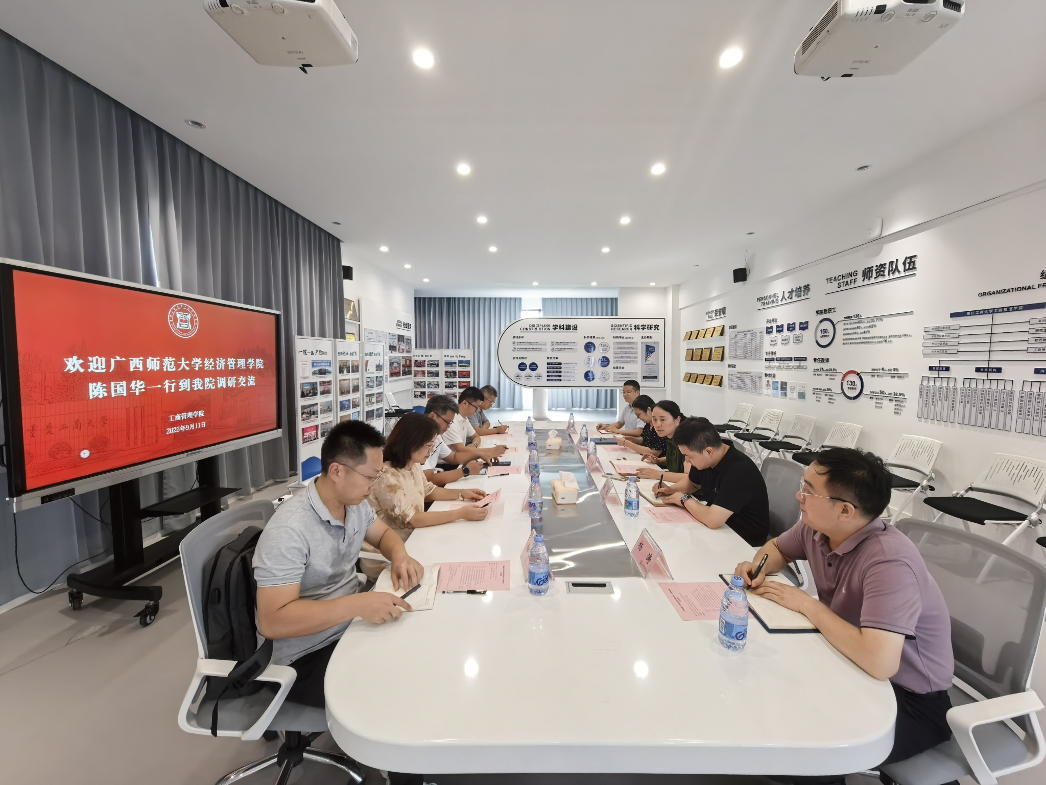 9月11日下午,广西师范大学经济管理学院党委书记陈国华一行5人来访调研交流。44118太阳成tyc城集团党委书记陈亚惠,院长陈伟,副院长邱继勤,工商管理管理系主任杨涛,市场营销系主任王永龙参加了本次交流。