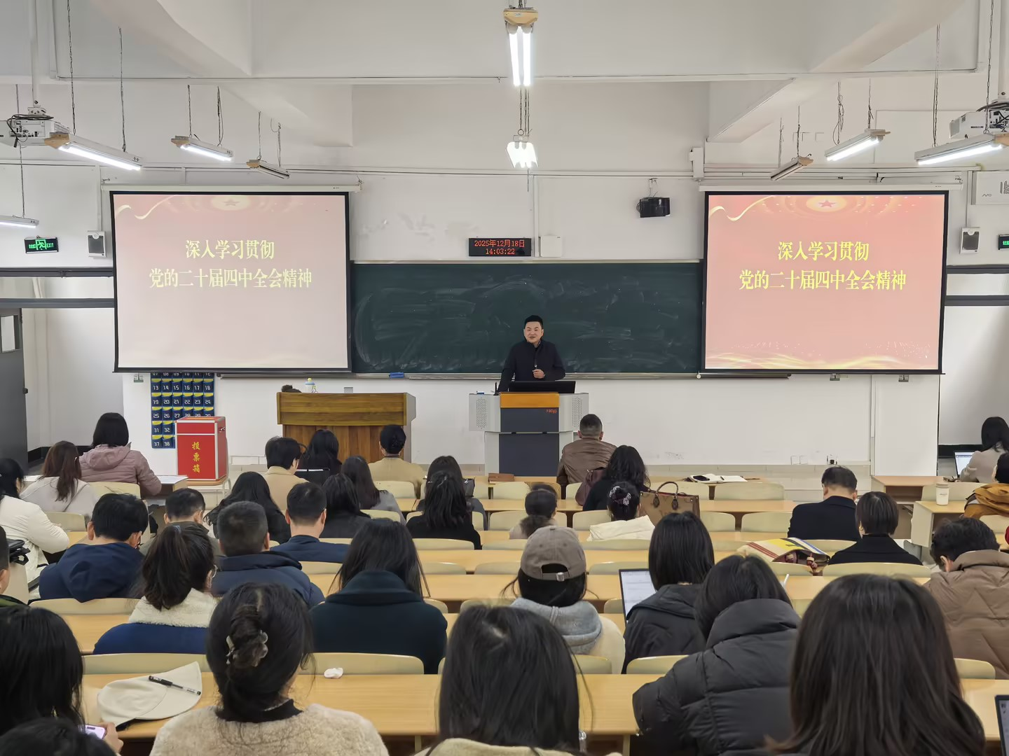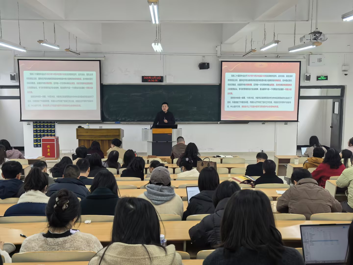 围绕党的二十届四中全会整体情况、准确把握“十五五”时期在基本实现社会主义现代化进程中的重要地位、深刻领会“十五五”时期经济社会发展的指导方针和主要目标、全面理解“十五五”时期经济社会发展战略任务和重大举措、坚持和加强党的全面领导、系化推动四中全会精神在重庆一贯到底、我校十四五期间工作亮点七个方面开展系统宣讲。