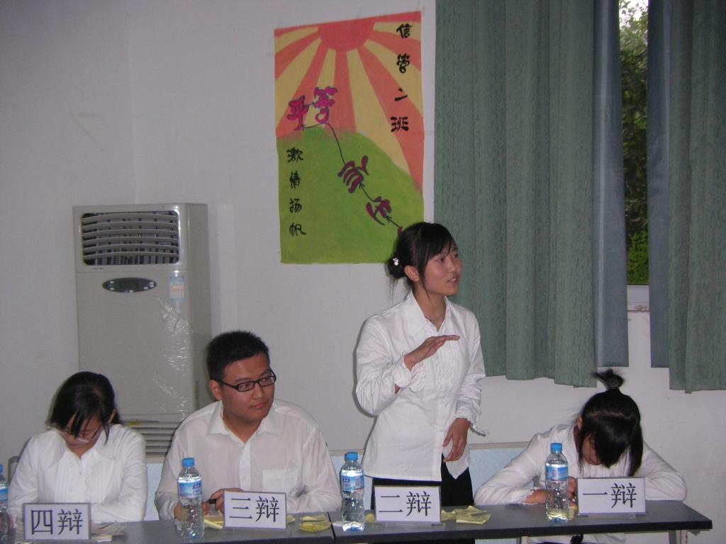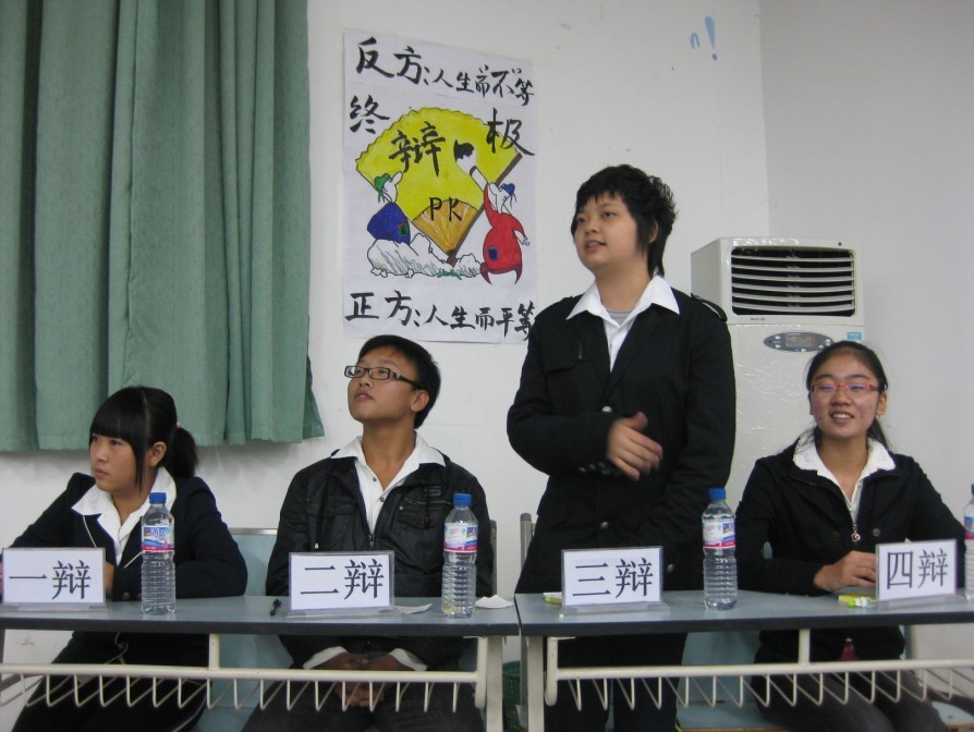 辩论双方09级信管二班和09级公管二班就“人,生而是否平等”这个话题展开了一场唇枪舌战。本场比赛的第一个高潮出现在攻辩环节,双方就“原始社会的人是否生来平等”、“09年重庆高考文科状元身份作假”以及“明星刘亦菲接拍广告轻松挣钱”等一个个生动的例子来论证各自观点。精彩的自由辩论则把本场比赛推向了又一高潮,双方辩手你来我往、针锋相对、巧妙设问、小心作答,在唇枪舌战中体现了双方辩手的睿智,辩手们精彩的答辩也博得了全场观众的热烈掌声。