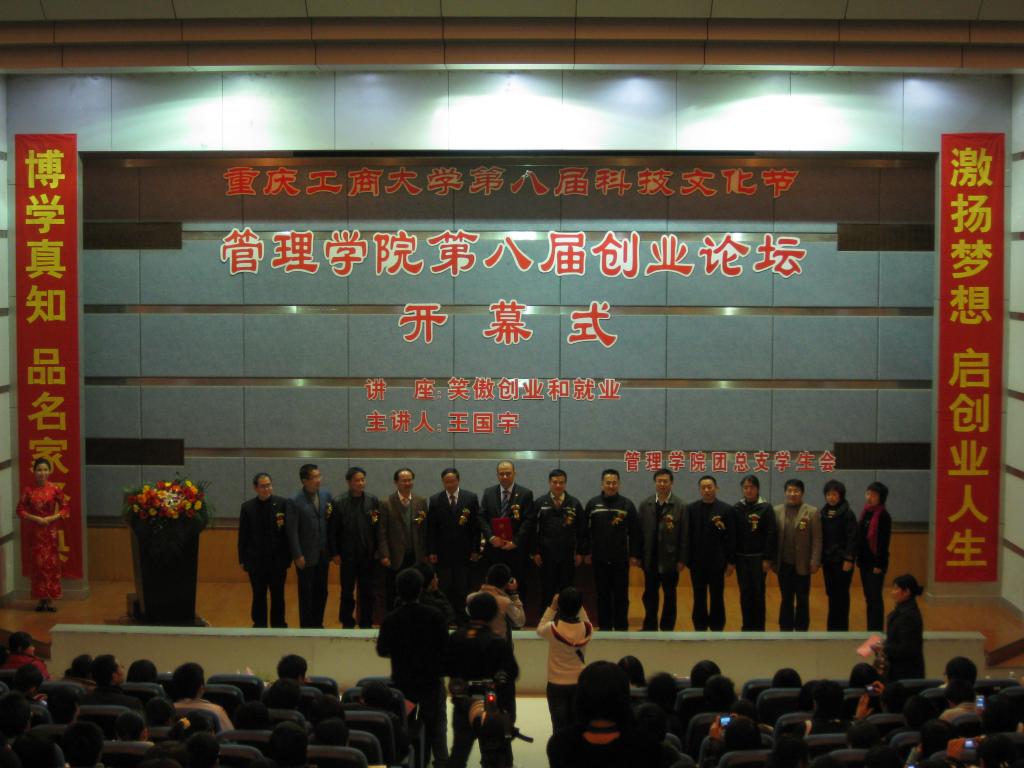 团总支舆情信息部讯11月23日19:00,重庆工商大学管理学院第八届“创业论坛”于博智楼7100报告厅隆重开幕。本届创业论坛开幕式邀请到的嘉宾为香港金鑫装饰集团、上海金鑫装饰有限公司董事长王国宇先生。同时,校宣传部余常德部长、校团委肖应红书记、校招生就业处赵驹处长、校公寓管理委员会汪友琼主任、管理学院党总支书记段远鹏副教授、管理学院院长梅洪常教授、管理学院副院长徐世伟教授、田双全副教授、管理学院党总支副书记唐仕军教授等领导也参加了开幕式。本次开幕式创业知识讲座由唐仕军教授担任嘉宾主持。