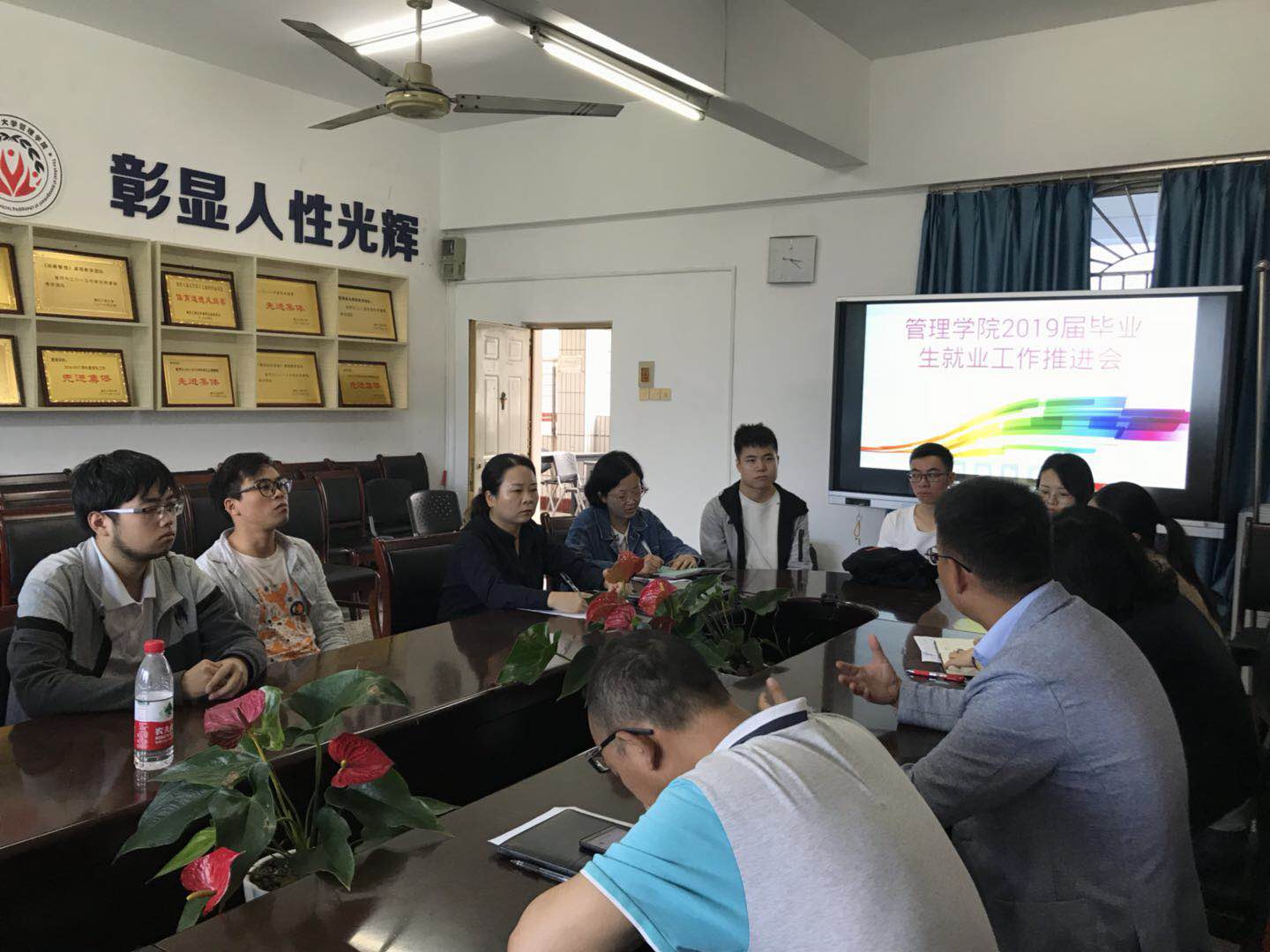 在毕业季来临之际,2019年5月29日下午3:00,管理学院在明德楼3021会议室召开了2019届毕业生就业工作推进会。管理学院分党委书记、副院长王建明,院长、分党委副书记杨柏,分党委副书记、纪委书记王静等领导出席了会议。学院就业工作负责人刘榴老师以及2019届毕业班辅导员聂树平老师、王瑛老师和各班毕业生代表参加了会议。