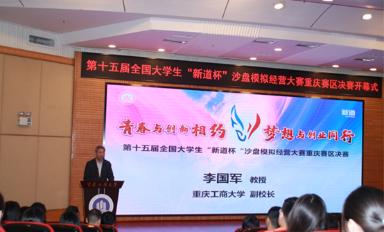 竞赛承办单位重庆工商大学副校长李国军教授在开幕式上致欢迎辞。李校长首先向主办单位重庆市高等教育学会财经教育专业委员会、新道科技股份有限公司的辛勤付出表示感谢,向前来参与本次大赛的兄弟院校和社会各界表示热烈欢迎。随后,李校长向参赛院校师生介绍了学校总体概况、管理学院和经管实验中心的基本情况,回顾了重庆工商大学学生参加沙盘大赛的历史和成绩,高度评价了沙盘大赛在“推动高校与行业、企业的深度合作,资源共享,搭建高校之间学习、交流的平台”方面发挥的积极影响。最后李校长祝愿大赛“产教融合、协同育人”的理念扎根重庆、开花结果,在培养推动大学生学术科技创新,促进青年学生全面发展方面发挥出更大作用。