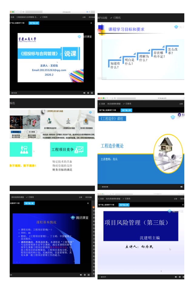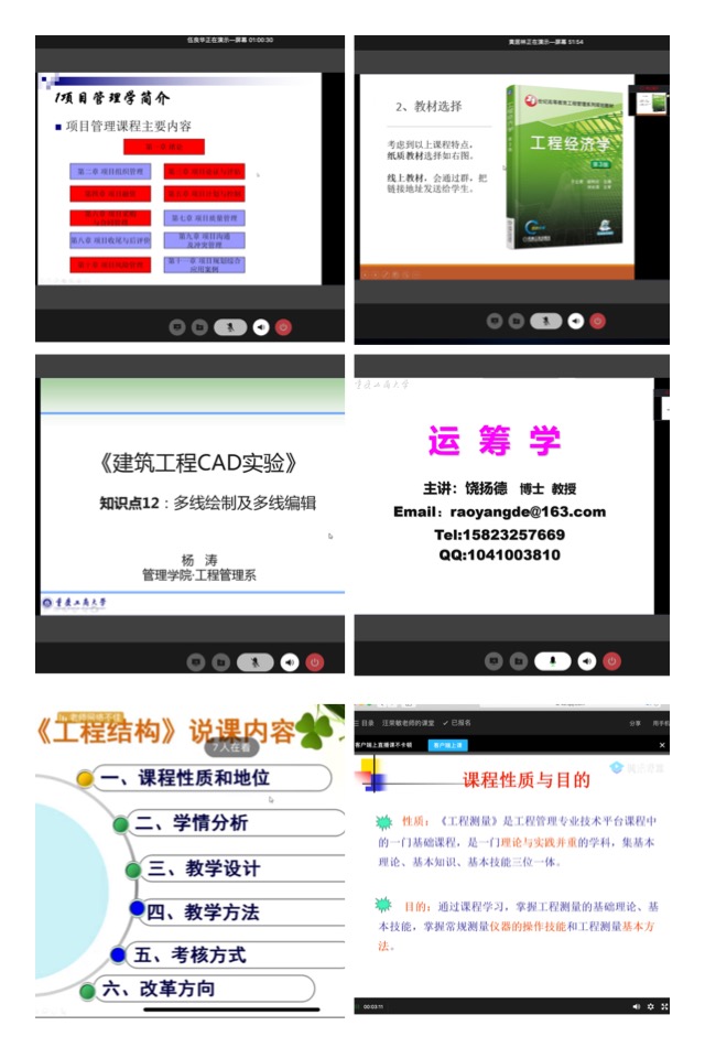 此次在线说课活动中,工程管理系全体任课教师通过充分利用重庆工商大学在线学习平台、企业微信、腾讯课堂等多个数字平台,展示了新学期开展在线教学的教学思路、授课内容。其中饶扬德、杨涛、黄居林、伍良华老师采用了“在线学习平台+企业微信+企业微信群”的形式对本学期课程进行在线说课,王子娟、汪荣敏、王初生、梁桂保、李娇、郑欢、向为民、肖兵老师采用了“在线学习平台+腾讯课堂”的形式对本学期课程进行在线说课。