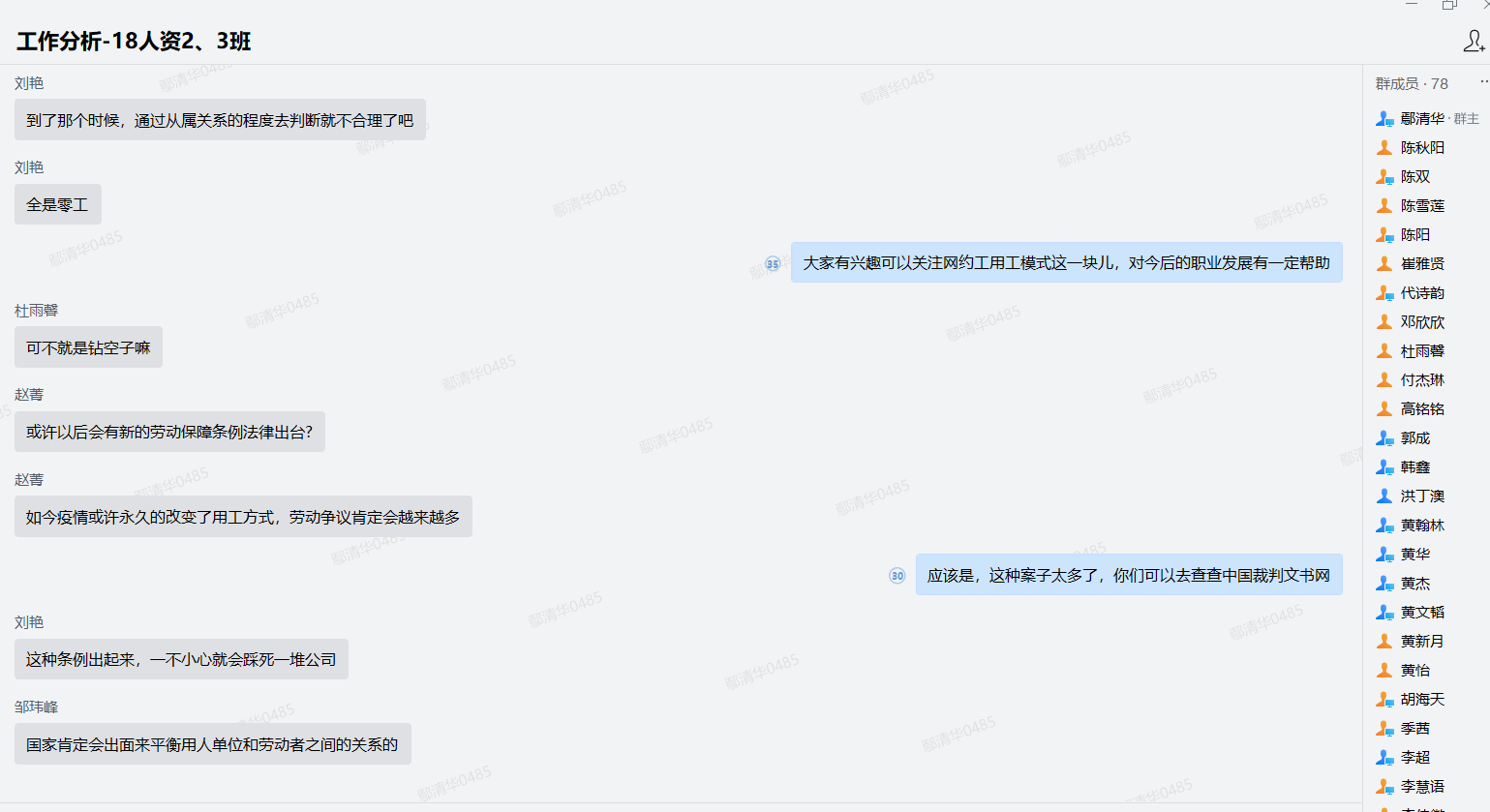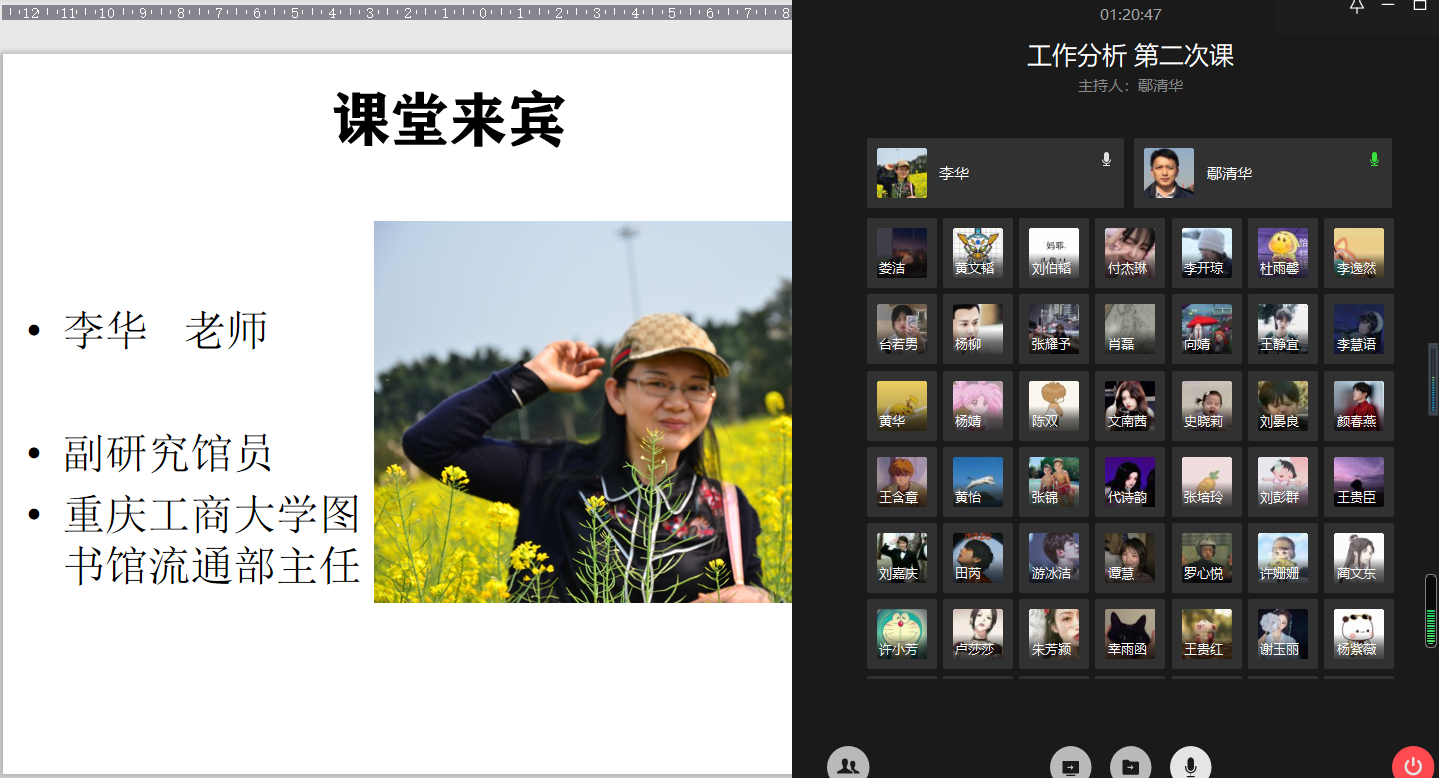 在鄢老师本周的授课中,有三个知识点邀请了三位不同界别的专业人士实时在线进课堂,参与师生讨论和点评。第一个点:关于工作的价值的探索,学生先回顾自己目前最喜欢的老师的情况,为什么喜欢这位老师?有两位同学发言,并邀请了我院唐仕军教授来分享他自己最喜欢的老师的片段以及自己对学生的付出的故事,最后总结教师的工作的职业价值问题,达到了双师同堂教学的效果;第二个点:工作价值的增值问题,学生先在线分组讨论三种职业的工作价值及价值增值问题,其中一个职业是图书馆管理员,鄢老师又在线邀请我校图书馆流通部主任、副研究馆员李华老师进入网络课堂,点评学生对图书馆管理员工作价值增值的思考和设计,并和学生互动;第三个点:网约工与平台的劳动关系问题,本部分是一个案例分析,学生先分成两组,赞同和不赞同两者是劳动关系的,学生各自回答其理由,然后鄢老师又在线邀请川外国际商学院徐副教授、劳动关系专家、兼职律师鑫鹏博士进入在线课堂点评学生的讨论,最后也与学生实现语音互动。