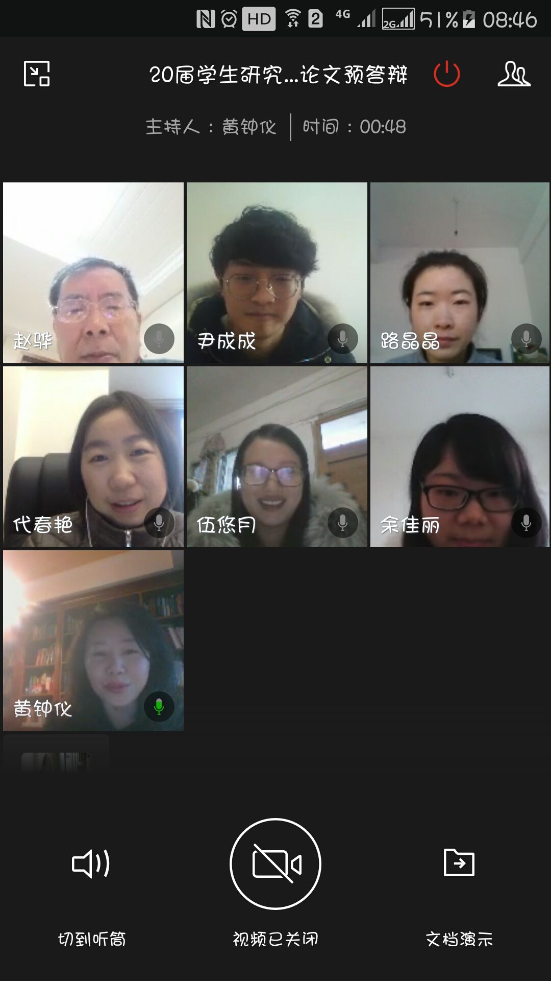 不返校,不停学,按时保质推进毕业研究生的各项教学工作,是我院疫情防控期间的总体原则。在继续严控新型冠状病毒肺炎疫情的形势下,我院制定的详尽的预答辩工作方案,经过前期建立线上分组、线上演练等充分准备,于3月13日上午,通过在线方式,顺利完成了2020届研究生预答辩工作。