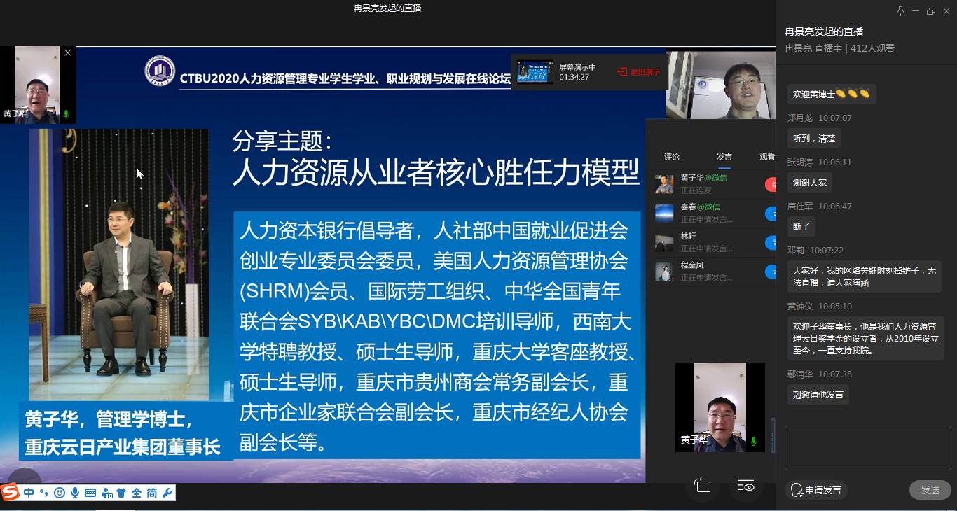 接着,论坛进入嘉宾分享环节。特邀嘉宾黄子华博士为大家讲解了人力资源从业者核心胜任力模型,并提出优秀的HR从业者的素质包括快速学习能力,跨文化沟通能力以及能快速融入当地的社会网络的能力,简短的分享,直指关键,使同学们和在线参会人员获益颇多;校友嘉宾张春喜总经理从业务方面告诉大家要“深入业务发展,成就多彩人生”,指出人力资源管理要深入业务、助力业务发展,同时结合自己的经历分享感悟,启迪学弟学妹们如何少走弯路、成就属于自己的精彩人生;校友嘉宾彭茜老师结合自身经历,分享了自己的学习、考研到就业的成长之路,勉励人资学子勤学奋进,不断拼搏,为论坛筹备组针对当下学生们关心的考研问题,特意邀请彭茜校友分享经验;校友嘉宾王明涛律师从律师的专业角度为大家阐述了HR从业者的法律素养,并通过实际案例阐述HR从业者法律素养的重要性,具备基本的法律素养,助力HR从业者职业生涯稳健向前发展;校友嘉宾曹洋铭总监与大家分享了如何营造个人及组织环境、助推HR生态发展,曹总监结合自身职业发展经历,从企业视角下的优秀人才、优秀人力资源从业者特质、如何构建个人成长池及如何构建个人-家庭成长圈等方面进行了精彩分享。嘉宾的分享,不同的视角,同一个目的,即使HR专业的同学们如何找准自己的路、成就属于自己的职业精彩,嘉宾分享过程中通过对话框同学们积极与嘉宾、老师们互动,表达自己的深刻感悟,在互动问答环节里,人力资源管理系熊雪原博士等为同学们解答了考研相关问题,师生互动意犹未尽,人力资源管理系老师讨论决定,择日召开在线答疑语音会,专为同学们答疑解惑。