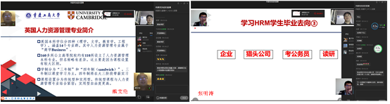 随后,进入国际连线环节,我们分别邀请到人力资源管理系教师在英国剑桥大学访学的熊艾伦博士、在美国北亚利桑那大学访学的邓莉博士(由于网络缘故邓莉老师通过录音的形式进行了分享)及在日本名古屋大学深造的张明涛博士为大家讲解人力资源管理专业发展现状,他们通过调查研究以翔实数据支撑分别介绍当地人力资源专业开设情况、培养过程、就业情况及出国留学申请情况等,并结合自身经历,为同学们的就业及出国留学等多方面提出自己感受和建议。