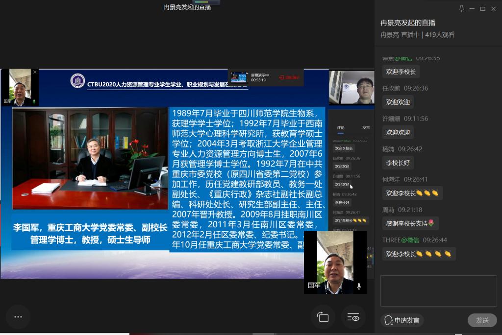 2020年3月14日上午9点,在我国新冠肺炎疫情防控趋势积极向好背景下,CTBU2020年人力资源管理专业学生学业、职业规划与发展在线论坛通过重庆工商大学“企业微信”平台直播顺利召开。出席此次在线论坛的有重庆工商大学副校长李国军教授,管理学院分党委书记王建明同志、院长杨柏教授、分党委副书记、纪委书记王静、副院长周莉教授、副院长黄钟仪教授、管理学院人力资源管理系系主任郑月龙博士。论坛邀请到重庆云日产业集团董事长黄子华博士为特邀嘉宾并作主题发言,邀请到校友嘉宾广州名度网络科技有限公司创始人、总经理张喜春先生,重庆房地产职业学院彭茜老师,重庆中雷律师事务所副主任、创始合伙人王明涛律师及重庆中科建设(集团)有限公司人力资源部曹洋铭总监等出席并发言分享。人力资源管理系全体老师、校友、同学、家长共计450余人次参与了论坛。论坛由管理学院人力资源管理系冉景亮博士主持。