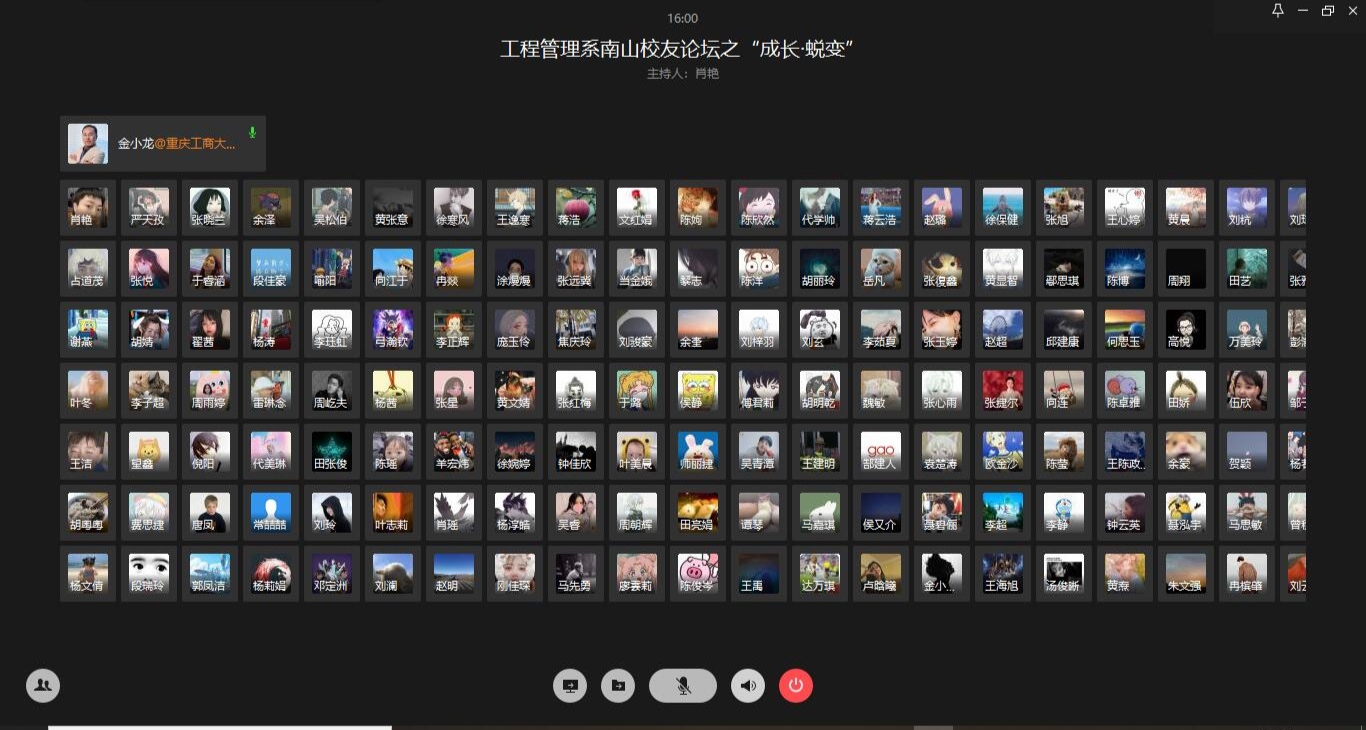 2020年3月14日晚上20:00,管理学院工程管理专业召开主题为“成长·蜕变”的第三期南山校友在线讲座。本次论坛采用企业微信线上会议形式,由工程管理系系主任肖艳老师主持,主讲嘉宾为金小龙校友(云南龙镁环境有限公司总经理)。会议邀请到管理学院全体院领导以及工程管理系全体专任教师,也吸引了管理学院及学校其他部门的领导、老师;工程管理专业部分校友、企业界人士参加,参会人数200余人。19级工程管理专业学生全体家长旁听了此次会议。