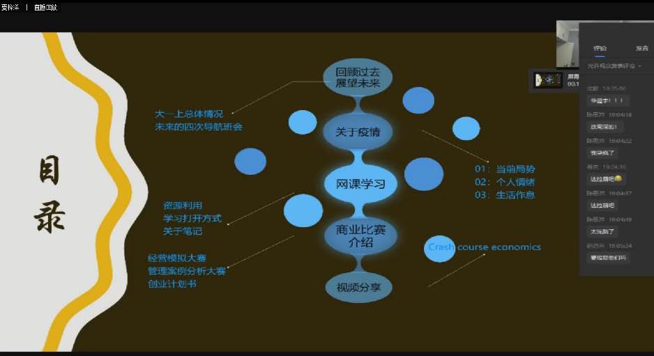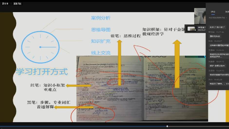 3月28日晚上19点,夏梓洋同学主持了工商管理三月导航班会。在企业微信的直播互动中,导航学长夏梓洋首先提醒学弟学妹关心当前疫情的局势,做好情绪管理和生活作息管理;其次就资源利用途径、学习方法、高效学习问题,结合微观经济学课程学习做了经验交流,传递了梳理笔记、整理知识框架等具体方法。再次鼓励大家通过比赛的方式来进行知识的扩充,并详细介绍了不同类型商业比赛的特点。最后,导航班会在微观经济学兴趣视频“course of economics” 的分享中结束。