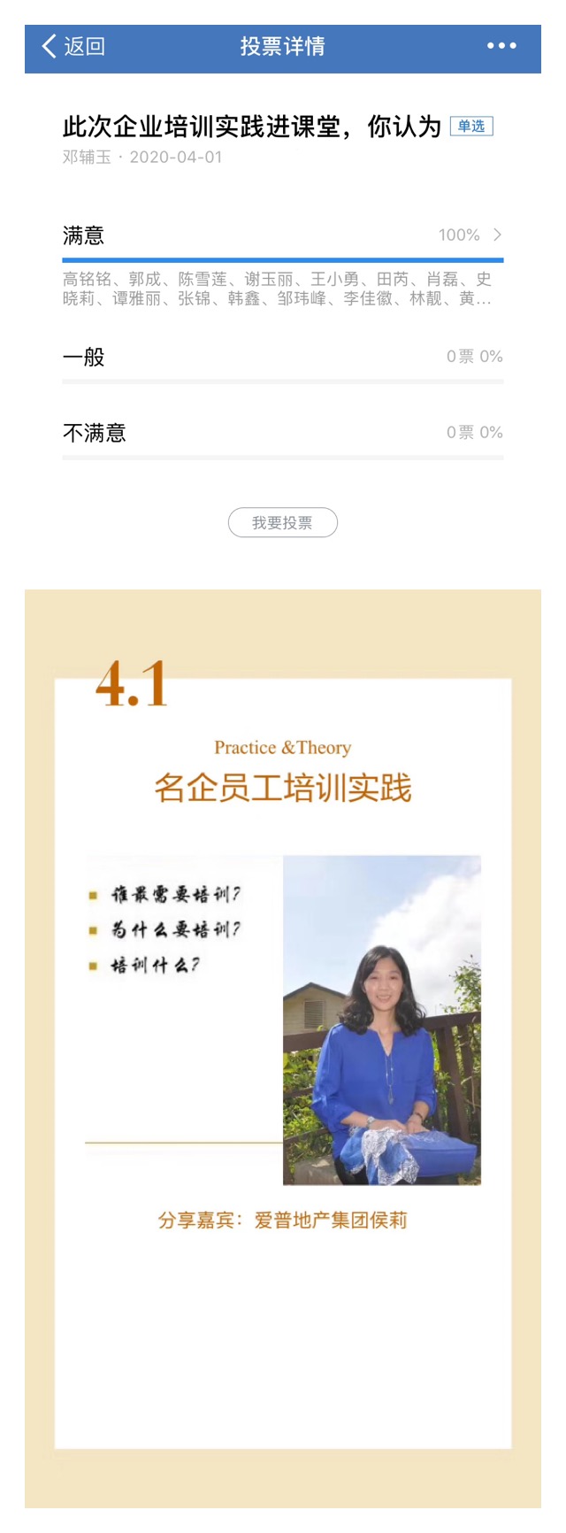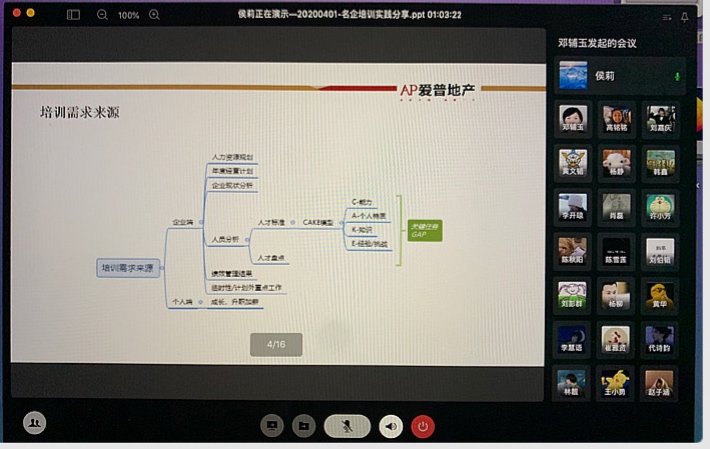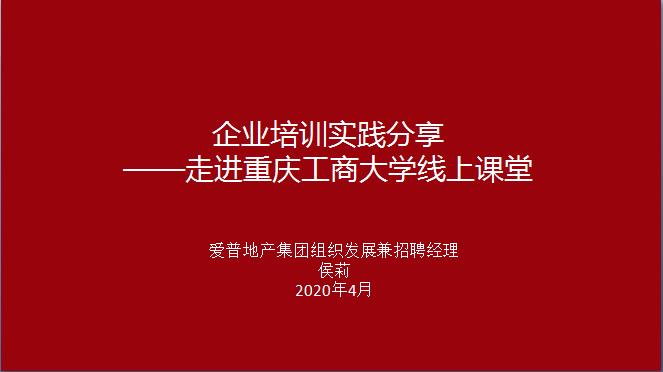 为了推动人才培养模式改革,推进产教深度融合及产教融合课堂教学改革成果的深化,提高学生理论联系实际的能力,管理学院人力资源管理专业《人力资源培训与开发》课程第一场行业专家进课堂“企业培训实践分享”如期和同学们在空中课堂见面。此次分享嘉宾是爱普地产集团组织发展与招聘经理侯莉。本门课程的任课教师邓辅玉主持讲座,18级人力资源管理专业的学生聆听了分享。