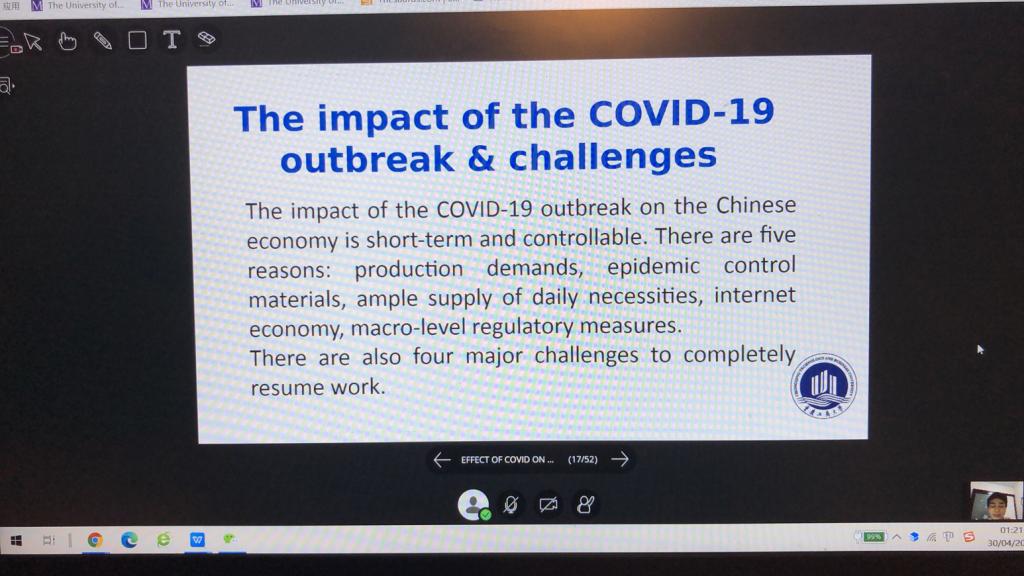 北京时间4月30号上午8:00-9:30(美国时间4月29日晚上8:00-9:30),管理学院工程管理系肖艳老师受美国克利夫兰州立大学的Roby Simons教授邀请,发表了“The impact of Coronavirus on Chinese economy & RE market”的主题演讲。