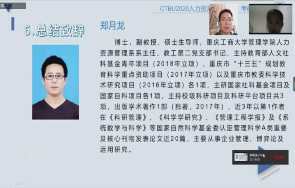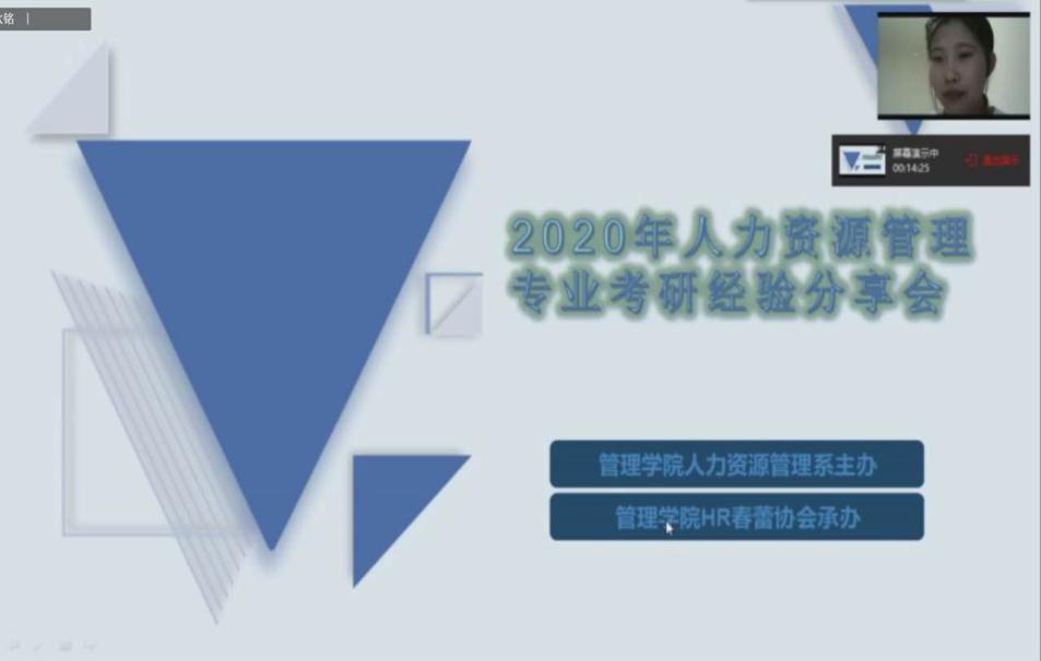 硕果6月,新冠肺炎疫情未影响人资学子的考研热情,为考研学子答疑解惑,由人力资源管理系主办、HR春蕾协会承办的2020年人资专业考研经验分享会线上会议于2020年6月12日成功举办。会议邀请到了管理学院分党委书记王建明出席,人力资源管理系主任郑月龙,教师冉景亮博士、熊雪原博士等参加了会议,同时邀请到16级考研成功的人资学子参会,17、18、19级人资专业部分同学参与了此次会议。本次会议由HR春蕾协会会长刘秋铭主持。