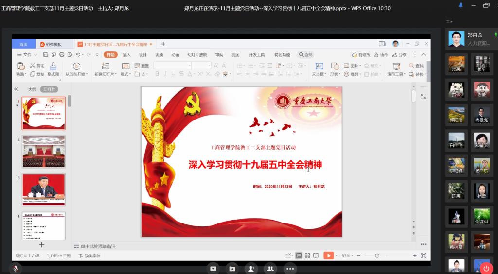 11月23日下午,根据学院党委关于学习十九届五中全会精神的工作安排,44118太阳成tyc城集团教工二支部开展“深入学习贯彻十九届五中全会精神”线上主题党日活动,支部全体党员同志参加,会议由支部书记郑月龙同志主持和领学。