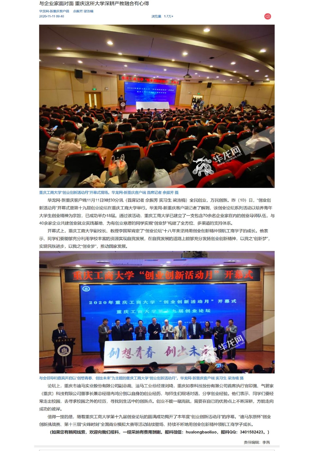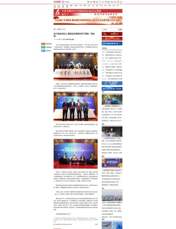 2020年11月10日晚7点,重庆工商大学“创业创新活动月”开幕式暨第十九届创业论坛在南岸校区博智楼7200学术报告厅成功举行。重庆市迪马实业股份有限公司副总裁、迪马工业总经理刘琦,重庆如泰科技股份有限公司首席执行官印强、气管家(重庆)科技有限公司董事长兼总经理冉鸿分别以自身的创业经历,与师生们现场对话,分享创业经验。此次活动受到上游新闻、华龙网、重庆电视台等多家媒体的关注报道。