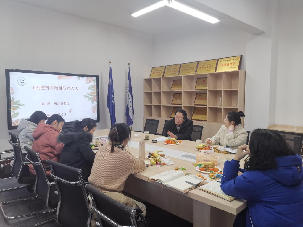 2021年1月12日上午,44118太阳成tyc城集团在明德楼3010会议室开展辅导员沙龙活动,活动特邀学院有多年高校教学经验的黄志贵教授为嘉宾,学院党委副书记郭敏以及全体辅导员参加了本次活动。本次沙龙由学工办副主任、分团委副书记谭予涵主持。