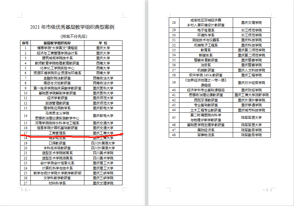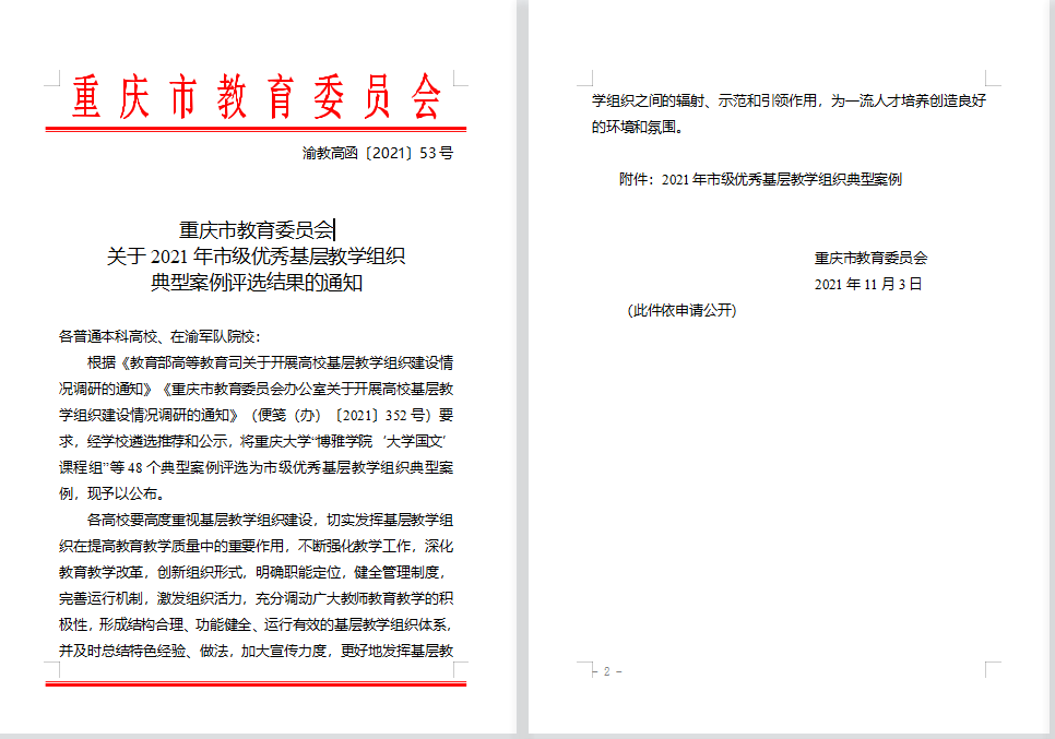 2021年11月3日,重庆市教育委员会公示了《关于2021年市级优秀基层教学组织典型案例评选结果的通知》(渝教高函〔2021〕53号),通知显示经学校遴选推荐和公示,将重庆大学“博雅学院‘大学国文’课程组”等48个典型案例评选为市级优秀基层教学组织典型案例。
