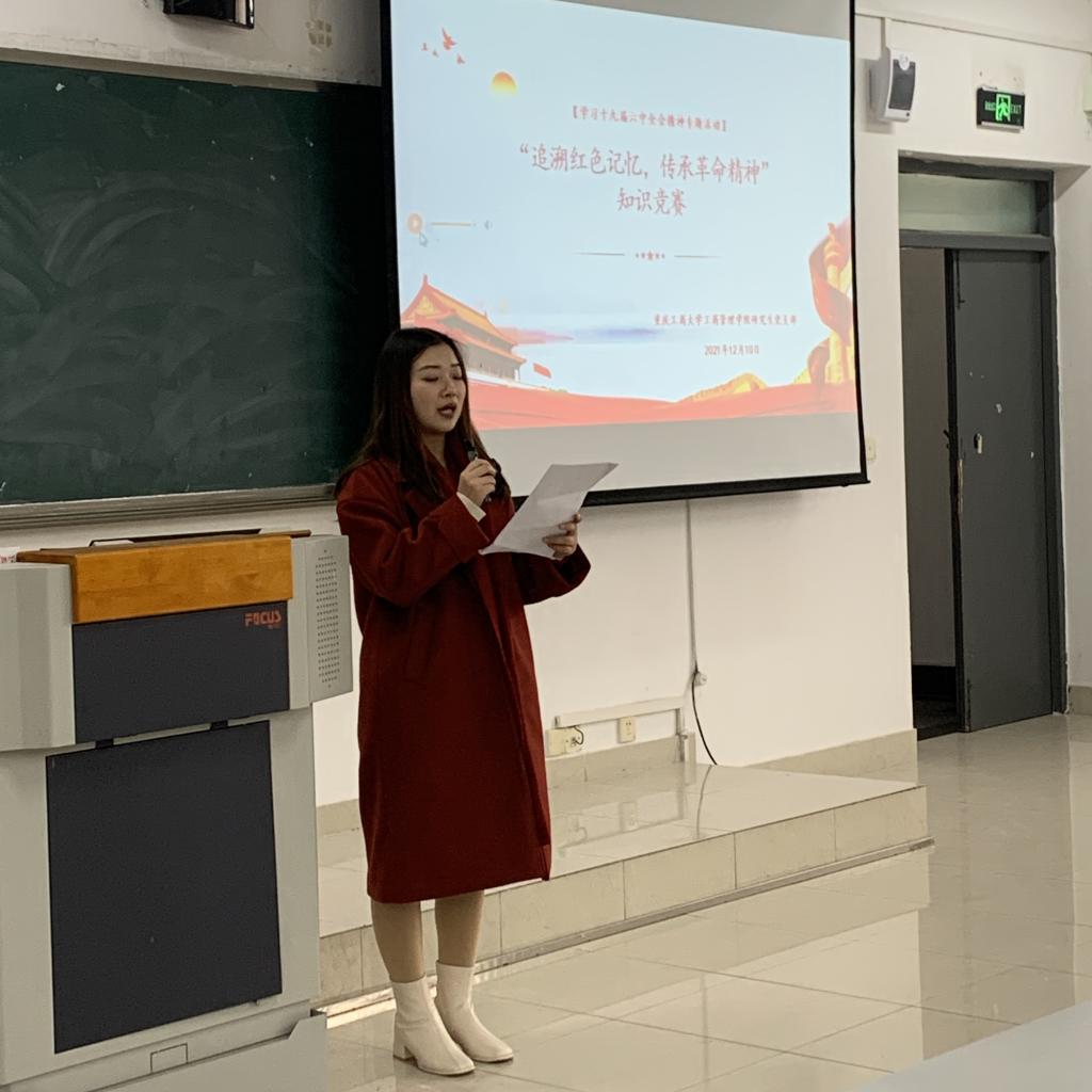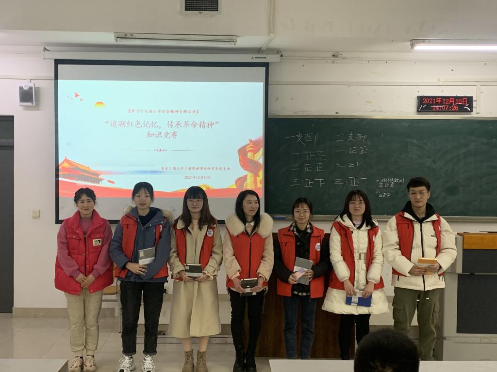 为深入学习和贯彻党的十九届六中全会精神,掀起学习“十九届六中全会”精神的热潮,营造浓厚的学习氛围,2021年12月10日在博智楼7321,研究生一、二支部全体党员共同举办了“追溯红色记忆,传承革命精神”党史知识竞赛活动。