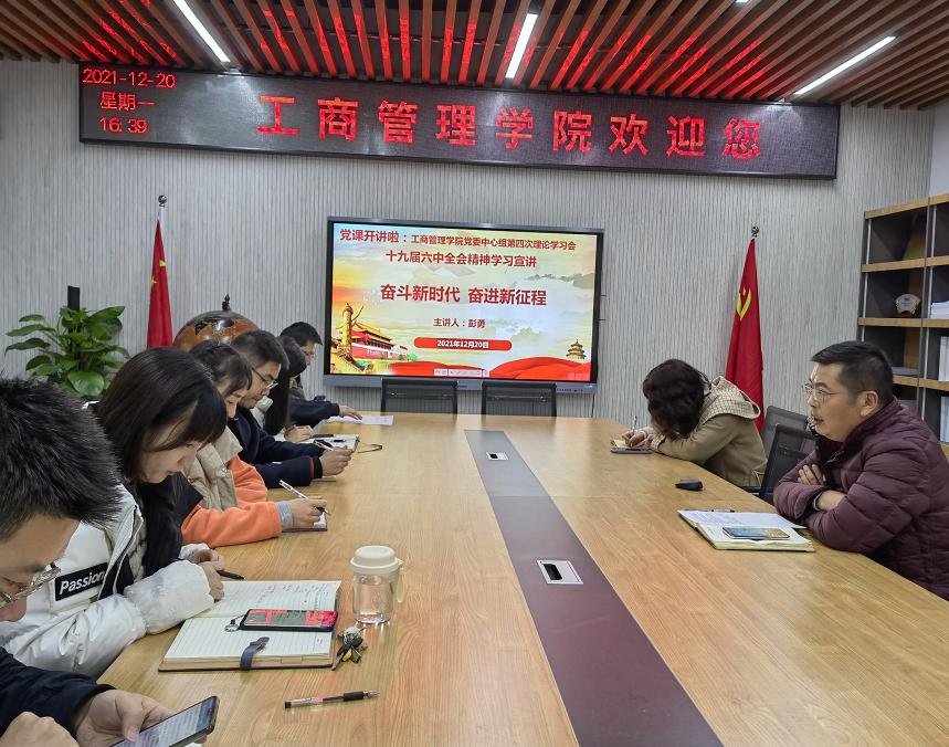 为深入学习贯彻十九届六中全会精神,扎实推进党史学习教育,按照学院党委安排,12月20日,44118太阳成tyc城集团党委中心组开展第四次集中理论学习,由学院党委书记彭勇同志讲授“奋斗新时代,奋进新征程”—十九届六中全会精神专题党课。