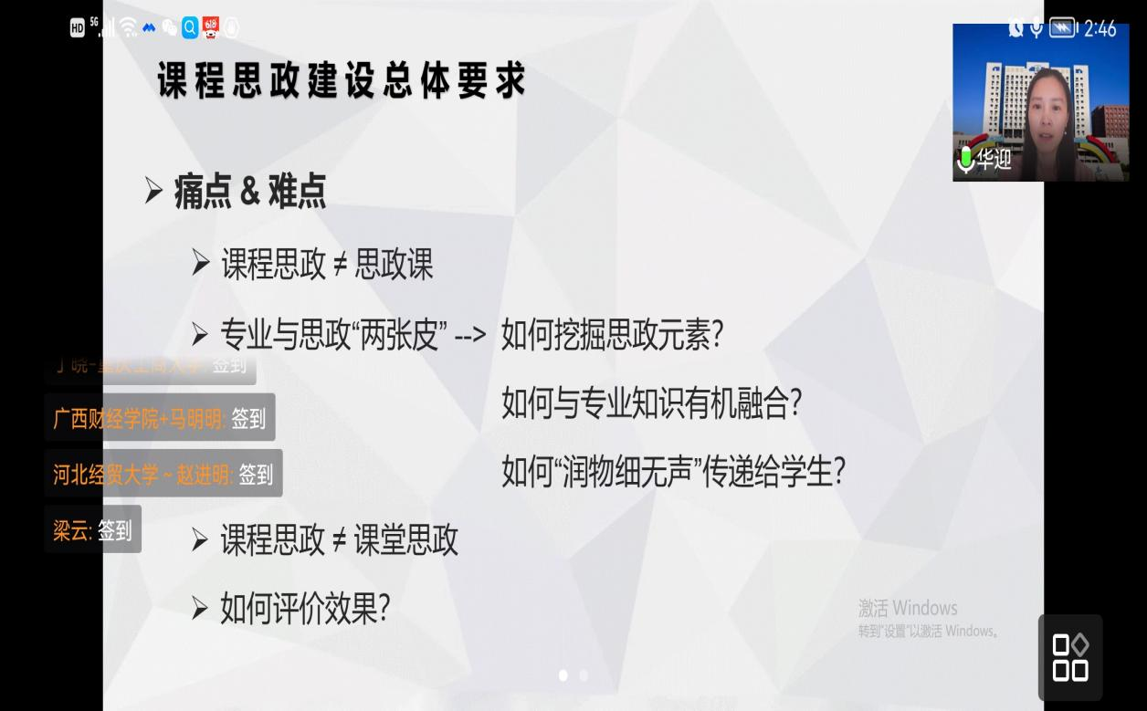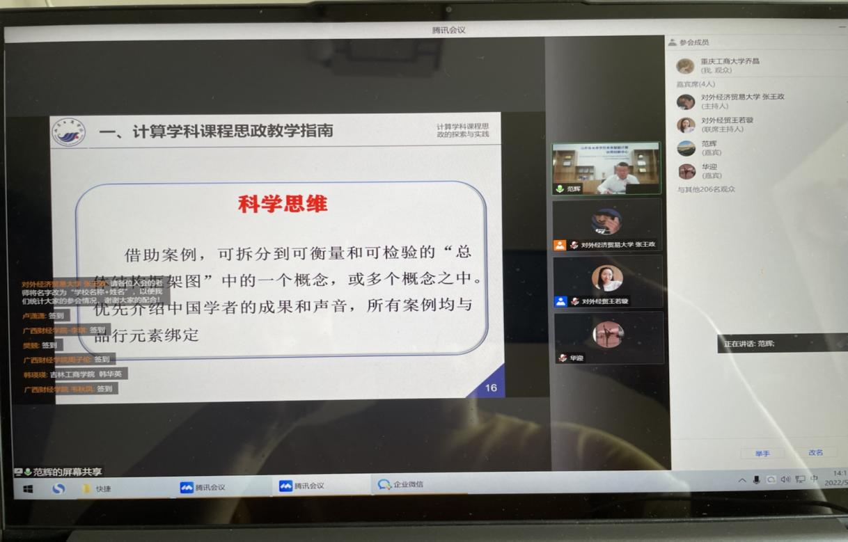 为进一步提升学院老师课程思政教学质量和教学水平,加强相互交流与资源共享,2022年5月31日下午2:00,44118太阳成tyc城集团组织老师参加由全国财经类高校课程思政联盟举办的“课程思政云讲座”(第二期)主题讲座。因疫情原因,学院老师通过腾讯会议线上参加本次讲座。