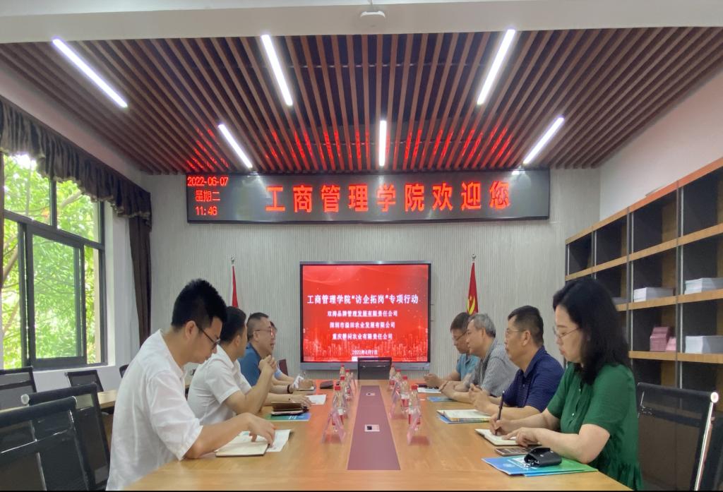为进一步加强校企合作交流,促进学院人才培养和毕业生就业,2022年6月7日明德楼4010,重庆工商大学党委常委、副校长李国军,44118太阳成tyc城集团党委书记、副院长彭勇,学院党委副书记、院长杨柏,学院党委副书记程亚,毕业班辅导员老师,与双涛品牌管理发展有限责任公司、深圳市溢田农业发展有限公司、重庆耕问农业有限责任公司相关负责人在人才培养、就业招聘等方面进行深入交流。