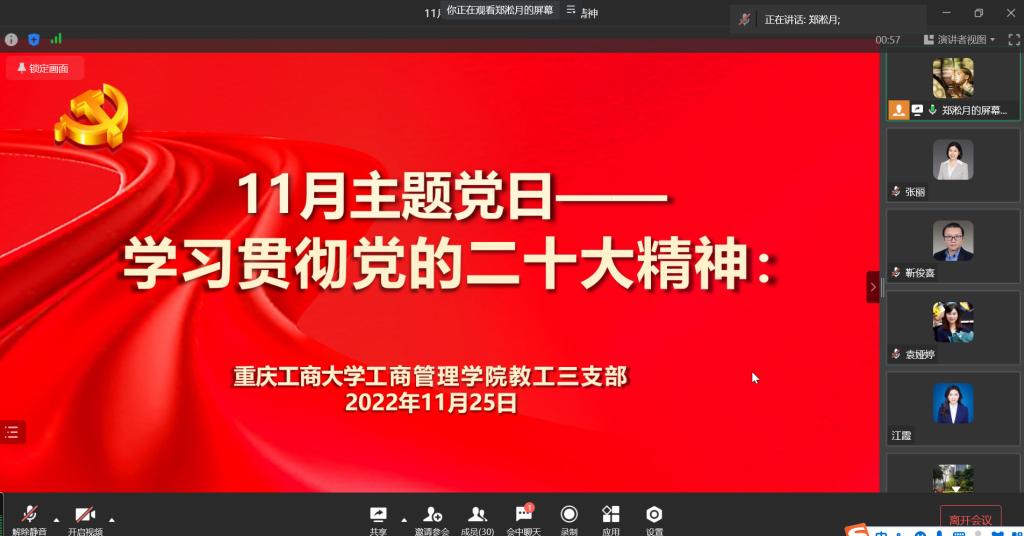 11月25日下午,按照学校党委统一部署,教工三支部在线上开展学习贯彻党的二十大精神主题学习会,教工三支部全体党员参加,学习会由支部书记郑淞月同志主持。