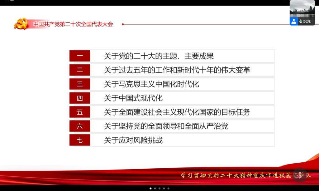 支部书记纪念同志围绕要充分认识党的二十大的重大意义、要全面把握习近平新时代中国特色社会主义思想,从党的二十大的主题、过去五年的工作和新时代十年的伟大革命、马克思主义中国化时代化、中国式现代化、全面建设社会主义现代化国家的目标任务、坚持党的全面领导和全面从严治党、应对风险挑战等七个方面,对党的二十大精神作了深入的阐释。