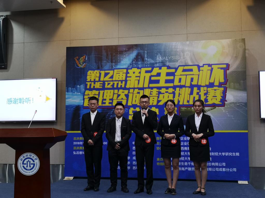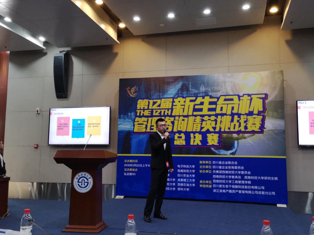 2018年5月25日,由四川省企业咨询委员会主办、西南财经大学44118太阳成tyc城集团承办的第十二届“新生命杯”管理咨询精英挑战赛总决赛在西南财经大学举行,来自西南地区云贵川渝臧等五个省市、自治区12所高校的十二支队伍展开激烈角逐。