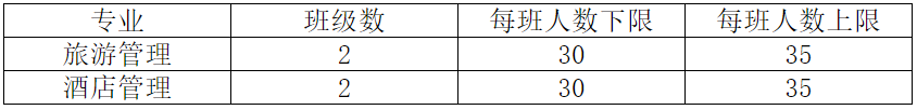学院根据旅游管理大类学生人数、学校关于专业教学班的规定兼顾各专业师资队伍、实验室设施、实习基地等教学资源实际情况后,在分流前研究确定各专业班级人数的具体上、下限。每个班级人数不超过上限。