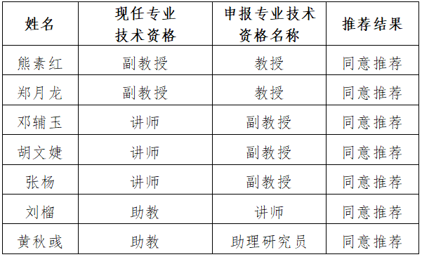 根据《重庆工商大学职称申报条件》(重工商大〔2021〕146号)、《重庆工商大职称评聘管理办法》(重工商大〔2021〕145号)等文件要求及有关规定,通过个人自主申报、学院对申报材料审核、对申报人员师德师风及现实表现进行考察,经学院基层评议推荐小组会议讨论审议,并通过现场表决,同意我院7名教师的专业技术资格申报。现将名单公示如下: