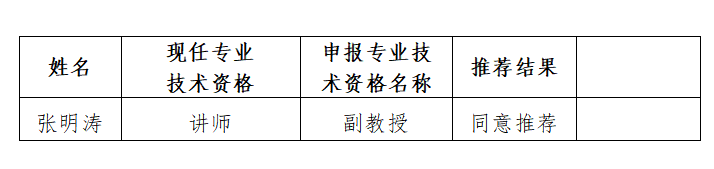 根据《重庆工商大学职称申报条件》(重工商大〔2021〕146号)、《重庆工商大职称评聘管理办法》(重工商大〔2021〕145号)等文件要求及有关规定,通过个人自主申报、学院对申报材料审核、对申报人员师德师风及现实表现进行考察,经学院基层评议推荐小组会议讨论审议,并通过现场表决,同意我院张明涛教师的专业技术资格申报。现将名单公示如下: