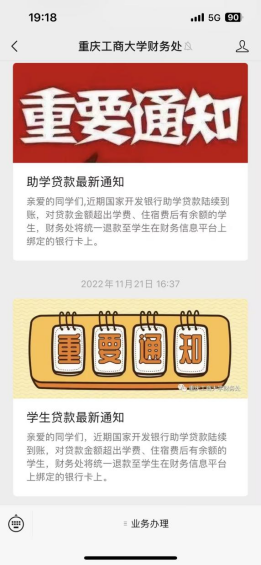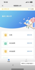 第二步:在微信公众号中点击菜单“业务办理”,选择“学费缴纳”,进入如下页面。