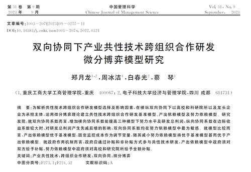 郑月龙,周冰洁,白春光等.双向协同下产业共性技术跨组织合作研发微分博弈模型研究[J].中国管理科学, 2023, 31(09):255-265.