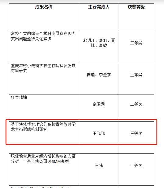 2024年2月1日,市教委发布通报(渝教基函〔2024〕16号),公布了第七届重庆市教育科学研究优秀成果奖获奖成果名单。据了解,第七届重庆市教育科学研究优秀成果评选奖励活动共评出获奖成果390项,其中基础教育类成果202项、职业教育类成果95项、高等教育类成果93项。我院王飞飞老师喜获重庆市教育科学研究优秀成果奖三等奖。