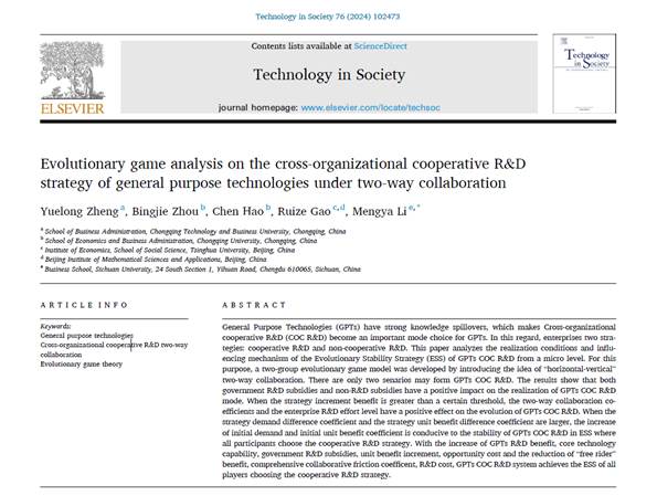 Zheng Y(郑月龙), Zhou B, Hao C, et al. Evolutionary game analysis on the cross-organizational cooperative R&D strategy of general purpose technologies under two-way collaboration[J]. Technology in Society, 2024: 102473.