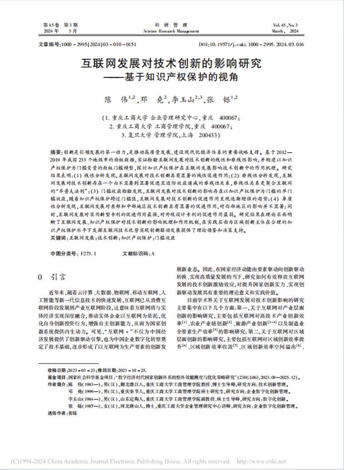 陈伟, 邓堯, 李玉山, 张铄. 互联网发展对技术创新的影响研究—基于知识产权保护的视角[J]. 科研管理(CSSCI核心期刊、国家自然基金委A类重要期刊、FMS中文T1期刊、重庆工商大学A2期刊). 2024, 45(3): 151-160.