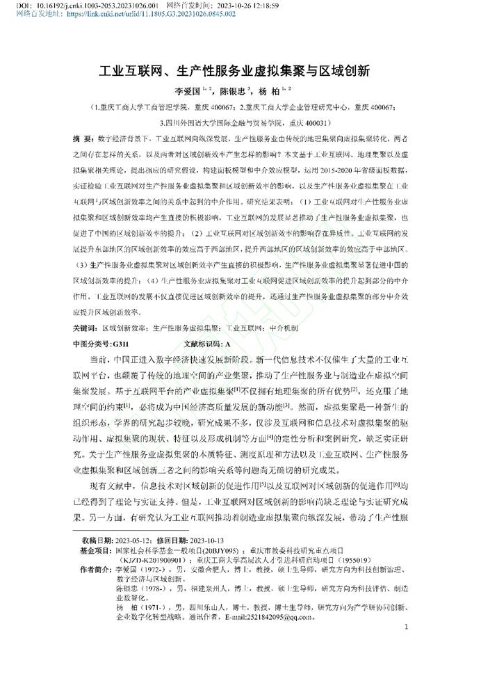 李爱国,陈银忠,杨柏.工业互联网、生产性服务业虚拟集聚与区域创新[J/OL].科学学研究:1-15.