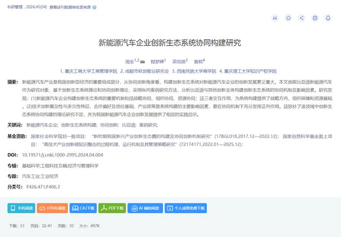 周全,程梦婷,吴绍波,等.新能源汽车企业创新生态系统协同构建研究[J].科研管理,2024,45(04):32-41.