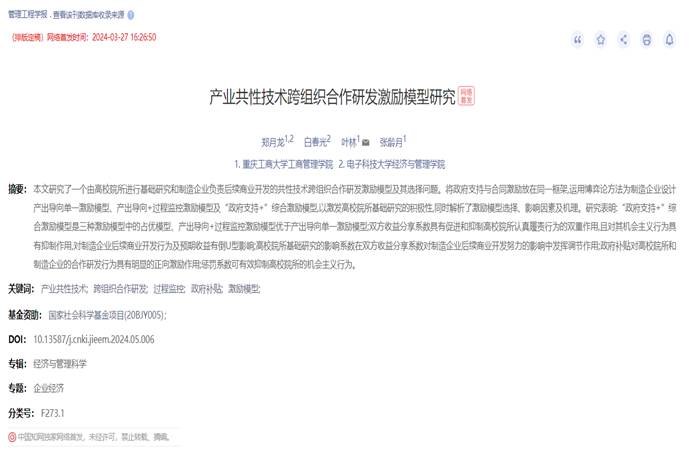 郑月龙,白春光,叶林,等.产业共性技术跨组织合作研发激励模型研究[J/OL].管理工程学报:1-23.